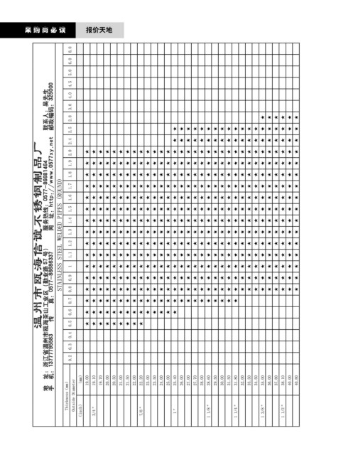 联系人:吴先生 邮政编码:325000 服务热线:0577-86681464 网 址:http://www.0577xy.net 号) 温州市瓯海信谊不锈钢制品厂 57 地 址:浙江省温州市瓯海茶山工业区(勤业路 手 机:13777795583 传 真:0577-86686337